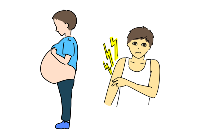肝臓で「アルブミン」というタンパク質が作られなくなることや、肝臓が硬くなることで血流が滞り(門脈圧亢進症)、血液中の水分がお腹(腹腔内)に漏れ出て溜まってしまいます。お腹が張る、体重が急に増える、足がむくむ、といった症状で気づかれます。