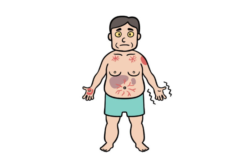 長期間の飲酒により、肝臓に中性脂肪が蓄積した状態です。放置して飲み続けると、肝炎、そして肝硬変へと進行するリスクがあります。